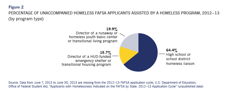 Nearly 22 million undergraduate and graduate students filed the Free Application for Federal Student Aid (FAFSA) during the 2012–13 application cycle, seeking help in paying for college. A small fraction of these students, 0.27% or 58,158 applicants, were homeless and contending with the stress of affording college without the support of a parent or guardian. Higher education offers unaccompanied homeless youth the opportunity for a more stable future because the average college graduate earns approximately $800,000 more in lifetime earnings than a high school graduate. Unfortunately, homeless students face unique challenges in completing the FAFSA; although 96.4% of all FAFSA applications were accepted in 2012–13, the acceptance rate was less than half (48.1%) for those submitted by homeless youth.