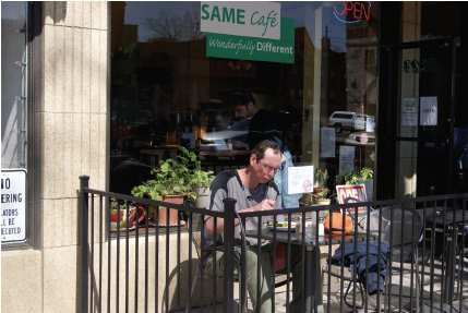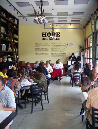 A far cry from the sometimes bleak layout and design of soup kitchens, community cafés are designed with the look and feel of typical restaurants. Some, like SAME Café, feature communal seating to foster conversation and discussion among patrons.