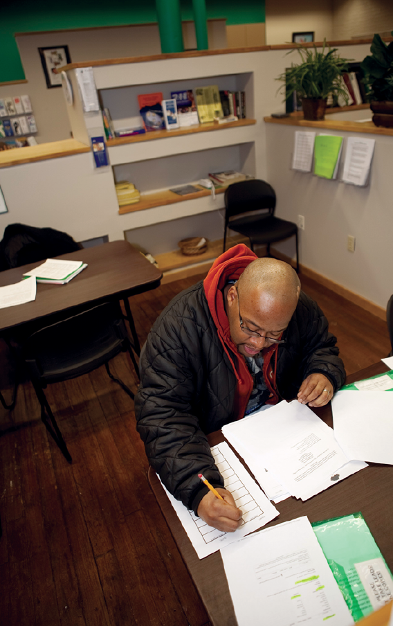 A job seeker fills out a job search application at Cincinnati Works. This organization pairs up unemployed or underemployed individuals with employers looking to fill entry-level positions in an effort to eliminate poverty in and near Cincinnati.
