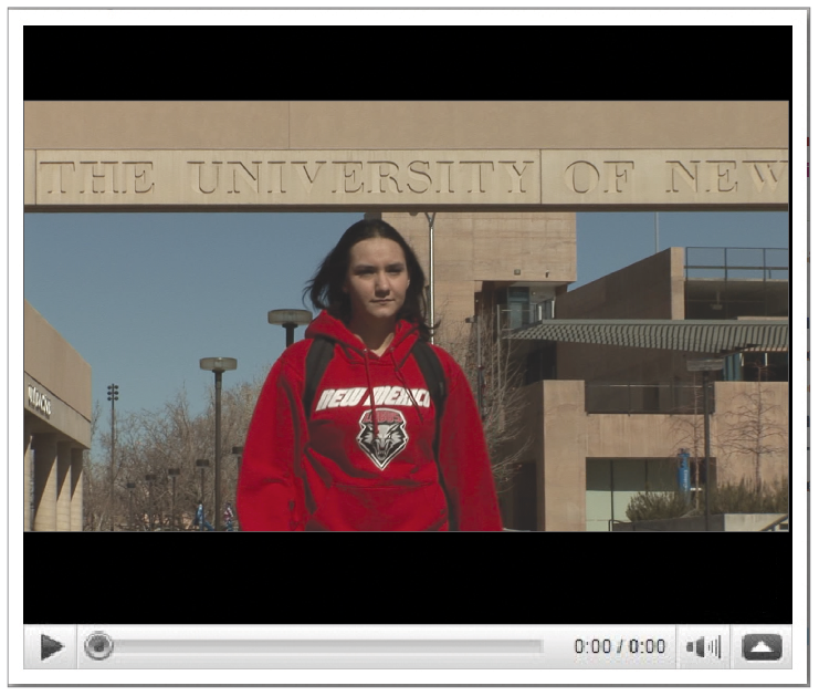 A video still from Looking In: Kids Who Are Homeless. Rachel Kindell, a formerly homeless youth at the University of New Mexico where she is currently enrolled in her sophomore year.