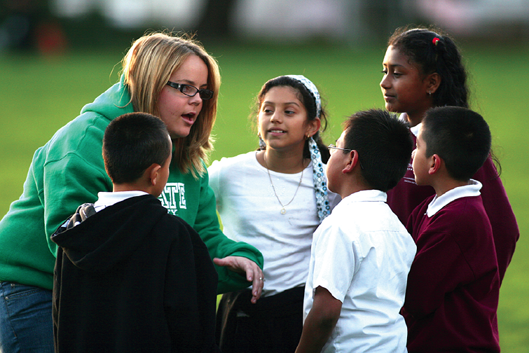 Young athletes from Team-Up for Youth learn new soccer skills from their coach, a local university student. Team-Up for Youth’s flagship program, Coaching Corps, trains and places college students and community members in youth sports programs.
