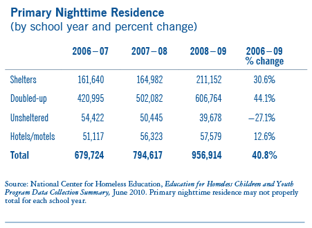 “A Critical Moment: Child & Youth Homelessness in Our Nation’s Schools,” (July 2010), National Association for the Education of Homeless Children & Youth, Washington, D.C., and First Focus, Washington, D.C.: www.naehcy.org.