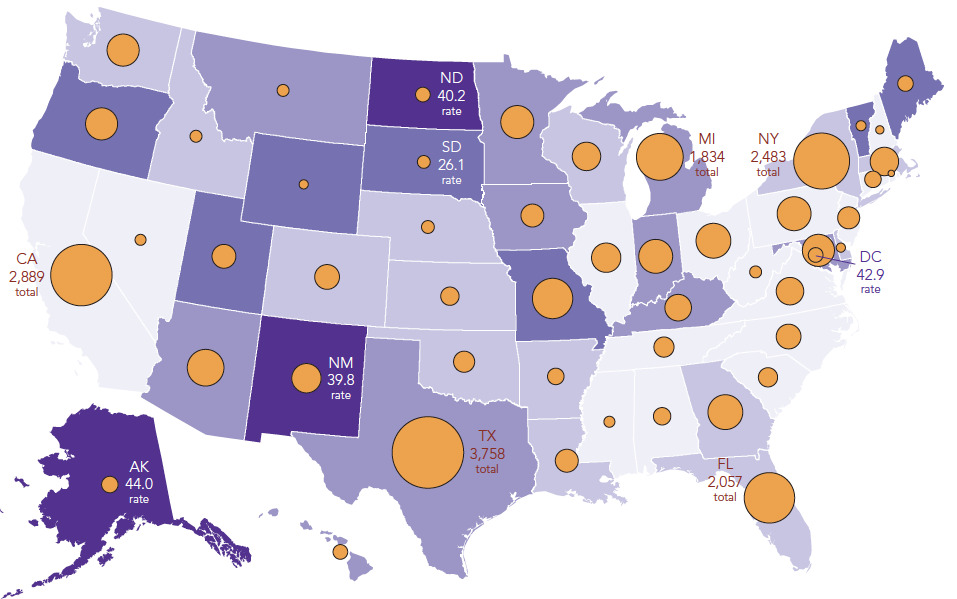 Approximately 15.5 million children are exposed to domestic violence each year. In 2010, 17,113 adults and 20,406 children escaping abuse were served in emergency domestic violence shelters and transitional housing throughout the country, with another 33,129 adults and children receiving non-residential assistance. Texas sheltered the most survivors (3,758) in 2010, while Alaska had the highest rate of survivors (44 per 100,000 persons [see map]). These data likely represent an undercount, as only one-quarter to one-half of women who experience domestic violence report their abuse. Domestic violence has a devastating effect on women nationwide, but its prevalence among low-income and homeless women is especially high; approximately 91.6% of homeless mothers experience severe physical and/or sexual abuse during their lifetimes.