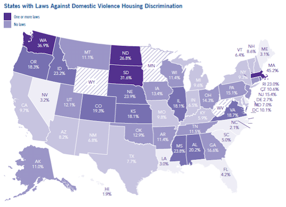 Note: Laws against domestic violence housing discrimination include, but are not limited to, defense against eviction; restrictions on the ability of public housing agencies to terminate tenancies or the requirement that they assist tenants who are forced to leave their housing; prohibition to waive tenant’s right to call law enforcement; requirement of landlords to release tenants from rental agreements; prohibit landlords from rejecting potential tenants based on their status as victims of domestic violence; or the ability to change locks for victims of domestic violence.